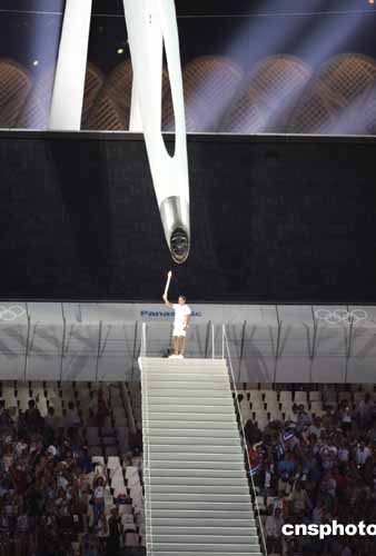 當(dāng)?shù)貢r間八月十三日晚,第二十八屆奧運(yùn)會在希臘雅典開幕,希臘前奧運(yùn)冠軍點(diǎn)燃奧運(yùn)火炬。中新社記者:毛建軍