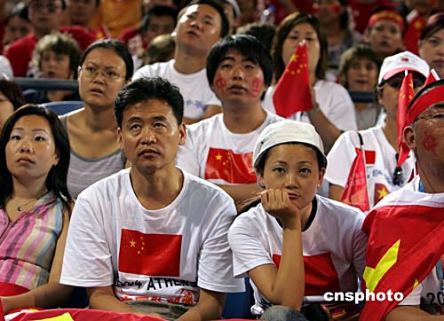 當(dāng)?shù)貢r(shí)間8月15日,中國男籃在雅典奧運(yùn)會(huì)首輪比賽中迎戰(zhàn)西班牙隊(duì),最終中國隊(duì)以大比分負(fù)于對手。圖為現(xiàn)場觀戰(zhàn)的中國球迷感到十分失望。中新社記者:任晨鳴