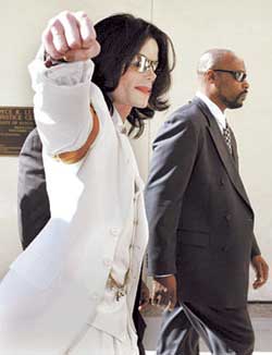 杰克遜這次身著的三件套裝全部為白色,另外他還戴了一個(gè)金色的袖標(biāo)以及腳蹬一雙亮閃閃的白色靴子。他乘坐一輛金色的加長房車抵達(dá)法庭門口,下車時(shí)受到了100多個(gè)大聲尖叫的歌迷的歡迎。