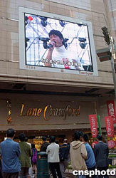 有百多名內(nèi)地、香港、臺(tái)灣藝人,7日下午4時(shí)起在香港大球場(chǎng)舉行馬拉松式的《愛心無(wú)國(guó)界演藝界大匯演》,為南亞海嘯災(zāi)民籌款,將全城籌款活動(dòng)推向高潮。圖為時(shí)代廣場(chǎng)直播大匯演的情況。作者:譚達(dá)明