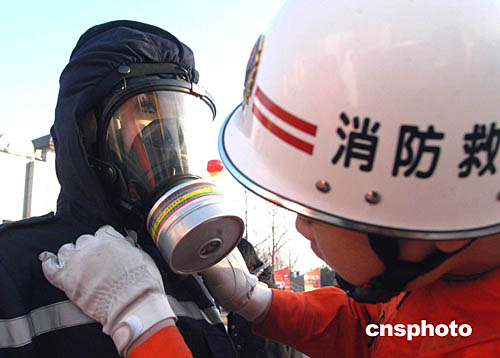 1月10日是“110”報警服務臺建臺19周年紀念日,110報警服務臺在北京西單文化廣場舉辦“110”主題宣傳活動。圖為消防隊員在向市民展示防化防核服。中新社記者:張宇