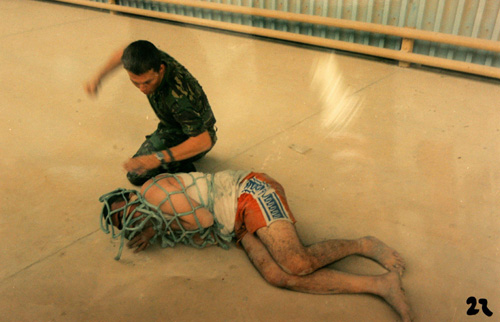 目前法庭已向媒體公布了22張這些士兵的“虐囚”圖片。這些照片在2003年5月被士兵當(dāng)作實(shí)施這些行為的“紀(jì)念品”而攝下,虐囚的地點(diǎn)則是在伊拉克南部城市巴士拉的一家救援物資倉庫。