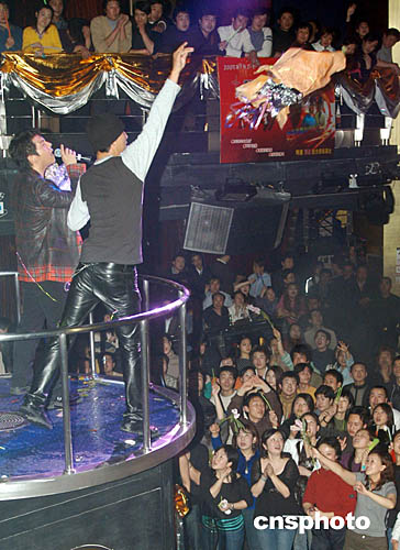 一月二十一日晚,著名演唱組合“羽泉”在北京一家新開業(yè)的DISCO演唱歌曲,令現(xiàn)場的觀眾興奮不已。作者:張宇