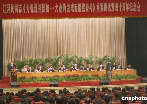 國務院臺灣事務辦公室主任陳云林在北京人民大會堂舉行的紀念江澤民對臺八項主張發(fā)表十周年大會上,代表中共中央臺辦、國務院臺辦和海峽兩岸關系協(xié)會祝臺灣同胞新春愉快,合家歡樂,萬事如意。作者:史利