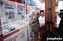 倍受關(guān)注的2005年臺(tái)商春節(jié)包機(jī)1月29日啟航,香港市民一早在報(bào)館櫥窗前瀏覽有關(guān)兩岸春節(jié)包機(jī)啟航消息。作者:洪少葵