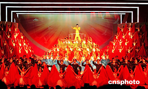 | 由七百多名解放軍及武警官兵參演的2005年軍民迎新春文藝晚會《春綠大地情滿懷》,二月二日晚在北京中國劇院舉行。中國國家主席胡錦濤、吳邦國、溫家寶等國家領(lǐng)導(dǎo)人與首都軍民歡聚一堂,共賀新春。圖為解放軍總政治部歌舞團(tuán)大牌演員彭麗媛的壓軸節(jié)目《高歌向明天》的表演。中新社記者:王麗南