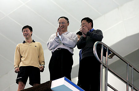 劉鵬一行來到跳水館后,首先在水池旁一邊觀看隊員訓(xùn)練,一邊與國家跳水隊領(lǐng)隊周繼紅等交談,了解了跳水隊春節(jié)期間訓(xùn)練的情況。對跳水隊春節(jié)期間堅持訓(xùn)練的奮斗作風(fēng),劉鵬局長非常滿意。他贊揚了國家跳水隊春節(jié)期間放棄休息堅持訓(xùn)練的精神,并高度評價了國家跳水隊“幾十年來經(jīng)久不衰”的優(yōu)秀運動成績。