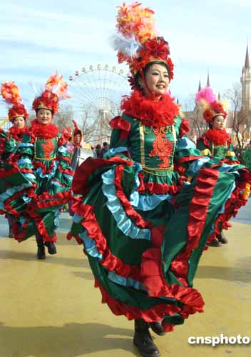 二月十日農(nóng)歷大年初二,北京石景山游樂(lè)園為北京百姓奉獻(xiàn)一道節(jié)日大餐——第五屆北京洋廟會(huì)。圖為身著艷麗西班牙節(jié)日盛裝的姑娘們,在石景山游樂(lè)園推出的特色品牌活動(dòng)——花車行進(jìn)表演中載歌載舞。作者:張勤