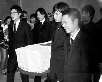 7時(shí)30分左右,文根英代表參加告別儀式的電影人宣讀了追悼詞———“善良、誠(chéng)實(shí)的你就像火花一樣一閃而過,就這樣永遠(yuǎn)離開了我們……你的笑容和你的聲音、你的一舉一動(dòng)都會(huì)留在我們的心中……你帶著最美好的回憶和美麗的心,安心地走吧……”接著是由池成朗讀了韓國(guó)著名詩(shī)人的悼念詩(shī)。最后,李恩珠生前好友BADA和歌手全仁權(quán)分別通過歌聲來追悼故人,通過歌曲表達(dá)了無比的悲痛和遺憾。BADA現(xiàn)場(chǎng)演唱了李恩珠平時(shí)最喜歡的頌歌,這時(shí)參加儀式的所有人開始給李恩珠獻(xiàn)花,為故人的靈魂祈福,愿她一路走好。