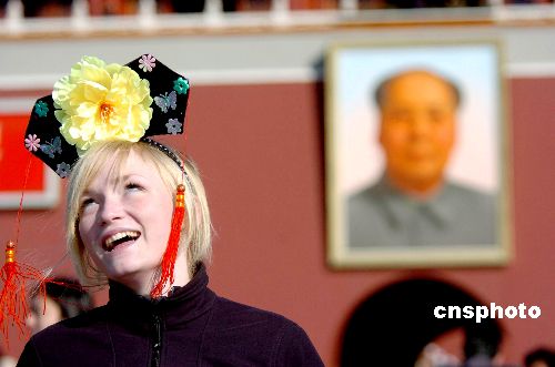 天安門廣場一位民警說,如今,大清早到天安門廣場看升旗的人越來越多了,有的是攜家?guī)Э趶耐獾啬酥梁M廒s來,最多的一個(gè)早晨有二三十萬人。一位福建游客告訴記者:不到北京不算完整的紅色旅游,任何人到北京都難免染上‘紅顏色’。