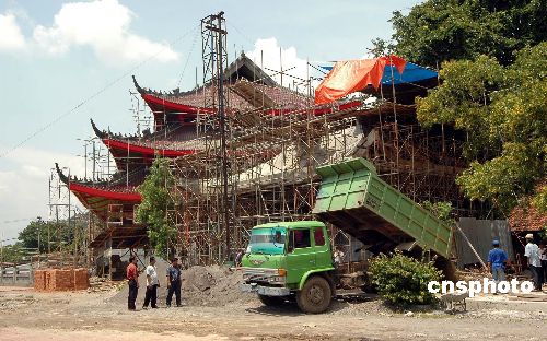 為紀(jì)念鄭和七下西洋六百周年,印尼三寶壟正在新建一座新的三寶公廟,面積三千五百平方米,廟宇寬大,氣宇軒昂,廟后鄭和七下西洋巨幅壁雕,人物逼真,氣勢磅礴。記者:蔣振江
