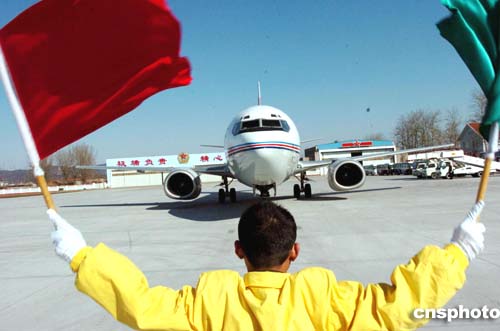 圖為北京西郊機(jī)場地勤工作人員引導(dǎo)安徽省代表團(tuán)所乘飛機(jī)進(jìn)入停機(jī)坪。作者:陳文