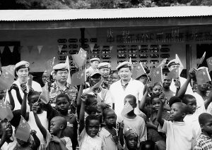 望著這些可憐的孩子,潘興太等隊(duì)員決定親自動(dòng)手,利用原來裝醫(yī)療用品的木箱,為師生制作一批課桌椅。一個(gè)星期后,當(dāng)隊(duì)員們將20多張像模像樣的課桌椅送到該校時(shí),180多名“黑孩子”和他們僅有的4位老師已早早地列隊(duì)守候在校門口。孩子們一接過隊(duì)員們親手做的課桌和板凳,“CHINA”、“BEI鄄JING”聲就不絕于耳。