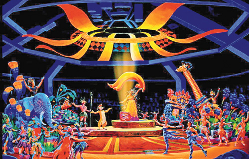 旅客亦可坐在一個(gè)容納二千二百人,以及有三百六十度觀景的劇院內(nèi)欣賞另一出歌舞劇“獅子王慶典”,八十五名演藝人員會(huì)在每天八次,每次三十分鐘的演出中,將《獅子王》的故事表演發(fā)揮得淋漓盡致。在歌舞劇中,旅客可聽(tīng)到由Elton John演唱的“Can You Feel The Love Tonight?”,以及其它《獅子王》的經(jīng)典金曲。