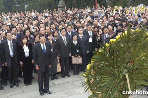 上午十點,拜謁儀式正式開始。江丙坤代表國民黨主席連戰(zhàn)及全體國民黨黨員向烈士敬獻花圈。參訪團所有成員均向烈士三鞠躬致敬。隨后宣讀的祭文中寫道:“壯哉先烈,死以報國,身毀名榮,英風(fēng)義烈,永為世率!