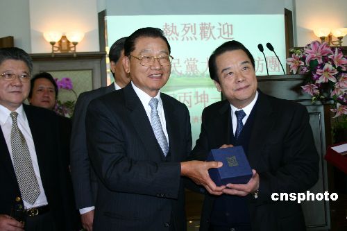 | 中國國民黨副主席江丙坤一行三十日中午在南京會見江蘇臺商。他表示,臺商在江蘇得到最好的照顧,他們的事業(yè)大部分都相當(dāng)?shù)某晒。臺商在這里的發(fā)展對大陸的經(jīng)濟(jì)發(fā)展也有相當(dāng)大的貢獻(xiàn)。但是,兩岸人民不但祈求經(jīng)濟(jì)的繁榮,更希望兩岸的和平,因為兩岸的和平才能帶來兩岸的繁榮。圖為江丙坤向江蘇臺商贈送禮品。作者:陳旻