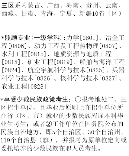 二、體現(xiàn)了統(tǒng)籌兼顧、協(xié)調(diào)發(fā)展的原則。根據(jù)我國東西部地區(qū)經(jīng)濟(jì)、教育發(fā)展不平衡的現(xiàn)實(shí)狀況,對(duì)報(bào)考西部地區(qū)和少數(shù)民族地區(qū)的考生以及少數(shù)民族考生采取適度照顧的政策。對(duì)礦業(yè)、地質(zhì)等11個(gè)艱苦專業(yè)繼續(xù)采取適當(dāng)照顧政策。