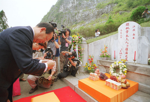 蔣孝嚴(yán)此前也數(shù)度來桂林祭母。最近一次是去年七月二十七日,攜夫人黃美倫來到長(zhǎng)眠于桂林市郊區(qū)馬鞍山西側(cè)鳳凰嶺下母親章亞若墓前祭奠母親,告慰九泉之下的母親已了卻認(rèn)祖歸宗的心愿。據(jù)悉,此次蔣孝嚴(yán)大陸之行,在桂林只作短暫停留。四日掃墓結(jié)束后,當(dāng)天下午便離開桂林,飛西安出席當(dāng)?shù)匾粋(gè)經(jīng)貿(mào)活動(dòng)。有消息稱,若時(shí)間允許,蔣孝嚴(yán)也可能順道訪國(guó)民黨主席連戰(zhàn)的祖母墳?zāi),為連戰(zhàn)的西安之行鋪路。之后會(huì)再飛返浙江溪口蔣氏故居祭祖,到毛太夫人墳前掃墓。