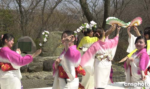 日本創(chuàng)價(jià)大學(xué)校園內(nèi)三日舉行傳統(tǒng)的“周櫻”觀賞會(huì)。三十年前,在創(chuàng)價(jià)學(xué)會(huì)會(huì)長(zhǎng)池田大作的提議下,首批留學(xué)創(chuàng)價(jià)大學(xué)的六名中國(guó)留學(xué)生種植櫻花樹(shù)苗,被命名為“周櫻”。此后,每年春暖花開(kāi)時(shí)節(jié)的“周櫻”觀賞會(huì),便成為此間日本友人緬懷周恩來(lái)的一項(xiàng)傳統(tǒng)活動(dòng)。圖為在“周櫻”紀(jì)念碑前,創(chuàng)價(jià)大學(xué)學(xué)生手持櫻花翩翩起舞。作者:王健
