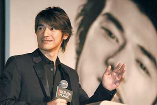 昨天的發(fā)布會設(shè)在劇場里面,舞臺兩邊早已掛起金城武最新拍攝的兩張碩大海報,一張溫文爾雅,一張則性感十足。當(dāng)金城武出現(xiàn)時,先是全場一片漆黑,然后又是一陣強(qiáng)光和一團(tuán)煙霧,他一個人孤零零地站在寬大舞臺上接受著下面的驚聲尖叫,這種架勢持續(xù)了好幾分鐘,使得他不好意思地站起身來,一會兒摸摸腦袋,一會兒又把手插進(jìn)褲袋。而當(dāng)主持人不斷向他拋來“你簡直驚若天人”、“你身上有卓然不同的男人氣質(zhì)”等贊美之語時,他雙手緊握著麥克風(fēng),不斷彎腰說謝謝。當(dāng)主持人問他喜歡現(xiàn)場掛的哪張廣告照片時,金城武謙虛地說:“不要再夸我了,其實(shí)突然看見這么大一張自己的臉,我覺得很別扭!