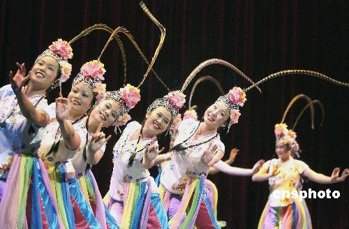 二00五年美國中華演藝學(xué)院華裔學(xué)生匯報公演四月十七日在加州圣塔克拉拉大學(xué)舉行。圖為華裔學(xué)生們表演中國古典舞《俏花旦》。作者:陳鋼