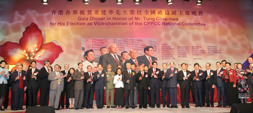 近五百個(gè)大小機(jī)構(gòu),今晚在香港會議展覽中心合辦“香港各界祝賀董建華先生榮任全國政協(xié)副主席晚會”,祝賀董建華出任全國政協(xié)副主席,并感謝其對香港社會發(fā)展之貢獻(xiàn)。