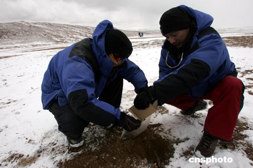探險隊為環(huán)境保護(hù)科考項目采集土壤標(biāo)本(圖)