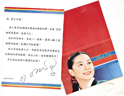李英愛原定昨日中午十二時十五分乘車往機場,但由于她堅持要在送贈各大傳媒的答謝卡上簽名,因而延遲至十二時四十五分才離開酒店。薄施脂粉的“長今”,手挽LV袋,配襯牛仔褲,精神奕奕地步出酒店,當她發(fā)現(xiàn)在場有十多名fans守候,隨即主動走近,并為他們逐一簽名留念,才上車前往機場。