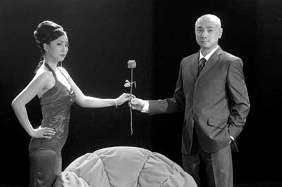 5月30日下午,記者走進(jìn)煤礦文工團(tuán)的安源小劇場(chǎng),只見陶虹身穿一件紫紅色的露肩晚禮服,徐崢則穿著一身筆挺的西服。他們兩人分別站在一個(gè)紅色布藝沙發(fā)的兩側(cè),頭頂上是大量的聚光燈。劇場(chǎng)里的陣勢(shì)和時(shí)尚節(jié)目的拍攝別無二致?墒,陶虹、徐崢卻是在為他們二人主演的戲劇《最后一個(gè)情圣》拍攝電視宣傳片。