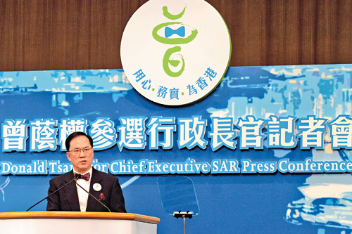 他透過(guò)面前密集的媒體大陣仗,向香港市民正式宣布參加中華人民共和國(guó)香港特別行政區(qū)行政長(zhǎng)官選舉,同時(shí)公布他的施政綱領(lǐng)。