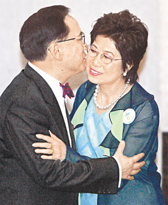 當(dāng)曾蔭權(quán)走下講臺(tái)時(shí),立刻與迎上前去的太太鮑笑薇擁抱。此時(shí),他的競(jìng)選助手們正向媒體散發(fā)內(nèi)涵含講詞和政綱的彩色講義冊(cè),開(kāi)啟處被設(shè)計(jì)成上方有一藍(lán)色煲呔的淡綠西裝樣式。而冊(cè)子的背后,則是曾太寫(xiě)有施政理念“強(qiáng)政勵(lì)治,締造和諧,福為民開(kāi)”的十二字書(shū)法,抬首處是一枚篆刻小章“自強(qiáng)不息”。(完)