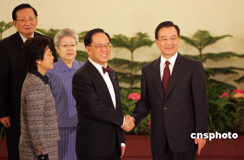 八時(shí)五十八分許,身著深色西裝、深紅色領(lǐng)結(jié)的香港特別行政區(qū)行政長官曾蔭權(quán)攜夫人步入香港廳。同樣著深色西裝、系深紅色領(lǐng)帶的國務(wù)院總理溫家寶與他緊緊握手。