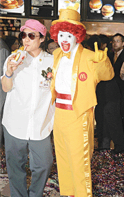 頭戴粉紅色帽子及架著墨鏡的陳奕迅,昨日精神奕奕出席麥當勞剪彩儀式,現(xiàn)場除有青春少女跳舞助興外,還有醒獅點睛、切燒豬及祝酒儀式,Eason與麥當勞叔叔喜相逢,二人合照留念,場面相當熱鬧。