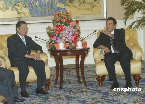 七月五日,中共中央臺辦主任陳云林在北京飯店會見臺灣華聚產(chǎn)業(yè)共同標準推進基金會董事長江丙坤。江炳坤率臺灣方面五十三人參加“海峽兩岸信息產(chǎn)業(yè)技術(shù)標準論壇”。作者:史利