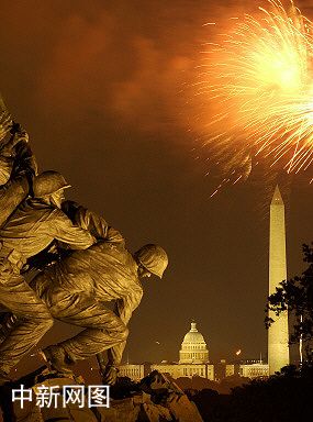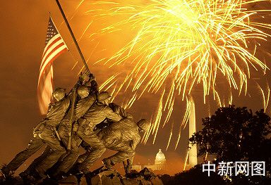 7月4日,圖為在美國費吉尼亞州阿林頓國家公墓的美國海軍陸戰(zhàn)隊紀(jì)念碑上空,紀(jì)念美國獨立日的煙火表演照亮夜空。