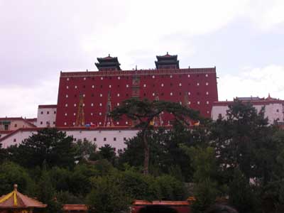 這座“小布達(dá)拉宮”始建1767年,歷經(jīng)4年竣工。它仿照了西藏布達(dá)拉宮“城”和山頂兩個(gè)部分,墻壁紅白相間,有藏式平頂?shù)锓俊⒉厥脚_(tái)塔、藏式殿堂等,但它又不僅是西藏布達(dá)拉宮的復(fù)制品,它在模仿中融合了漢族建筑傳統(tǒng),“漢藏合一式”的建筑特色在這棟占地22萬(wàn)平方米的寺廟中隨處可見(jiàn)。