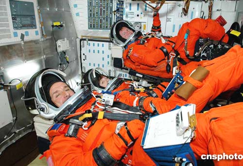 圖:美國“發(fā)現(xiàn)號”機組人員進入太空艙里