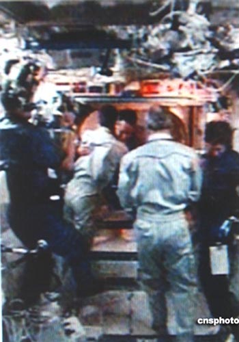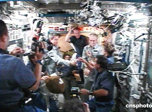 航天飛機發(fā)現(xiàn)號是7月28日7時18分(北京時間19時18分)和國際空間站軌道對接,經(jīng)過密封檢查,機組于美國東部時間8:50進入國際空間站。七名宇航員結(jié)束了兩天奔向空間站的飛行,這是自美國航天飛機2002年12月離開后,如今第一次造訪空間站。兩個機組會師太空,相互擁抱問候。