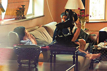 第二日,王菲與李亞鵬在第二日下午四時先起身,穿住T恤長褲,人字拖的王菲,與短衫短褲的李亞鵬由二樓睡房下到地下客廳,懶慵慵身貼身“攤”在巨型梳化上,“腳印印”看電視送“早餐”。由于二人婚前已同居一段時間,所以感覺相當老夫老妻。當發(fā)現(xiàn)有記者拍照時,王菲反應(yīng)相當敏捷,即時通知老公,并用手掩面,因不防有此一招,原本吊在她腳尖上的人字拖,亦在慌忙中飛脫落地下。