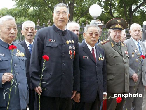 八月十八日,被邀請(qǐng)參加“和平使命—2005”中俄聯(lián)合軍事演習(xí)開(kāi)幕儀式的中國(guó)抗日老戰(zhàn)士和前蘇聯(lián)戰(zhàn)爭(zhēng)功勛軍人,來(lái)到“太平洋艦隊(duì)?wèi)?zhàn)斗榮譽(yù)”紀(jì)念碑敬獻(xiàn)花圈,向在衛(wèi)國(guó)戰(zhàn)爭(zhēng)中英勇?tīng)奚亩砹_斯軍人致以崇高的敬意。作者:王麗南