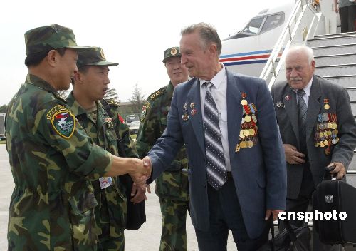 紀(jì)念反法西斯戰(zhàn)爭(zhēng)勝利暨抗日戰(zhàn)爭(zhēng)勝利六十周年之際,被邀請(qǐng)觀摩“和平使命—2005”中俄聯(lián)合軍事演習(xí)的俄羅斯十名前蘇聯(lián)二戰(zhàn)時(shí)期老戰(zhàn)士,八月十九日踏上中國(guó)的土地。他們各個(gè)胸前掛滿(mǎn)勛章,標(biāo)志二戰(zhàn)時(shí)期曾有的輝煌。圖為解放軍到青島機(jī)場(chǎng)迎接老戰(zhàn)士。作者:王麗南