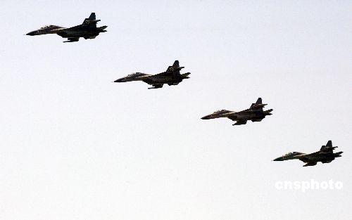 中俄聯(lián)合軍事演習(xí)海上封鎖演練中,蘇-27飛機(jī)以編隊形式飛過戰(zhàn)區(qū),與艦艇協(xié)同作戰(zhàn)。作者:王麗南