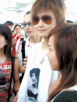 因?yàn)樵陂L(zhǎng)沙和李宇春同住一個(gè)酒店,記者看見前天晚上11點(diǎn)多還有人在李宇春住的“金牛座”門口守著,他們打算徹夜守在這里。昨天早上6點(diǎn)15分左右,記者退房途經(jīng)李宇春的“金牛座”,門口卻看不到一個(gè)人影,本以為“玉米”們都扛不住了,誰知當(dāng)記者7點(diǎn)10分到達(dá)長(zhǎng)沙機(jī)場(chǎng)時(shí),看到十幾個(gè)穿著黃色衣服的“玉米”手捧鮮花和禮物已經(jīng)等在機(jī)場(chǎng)大廳了。