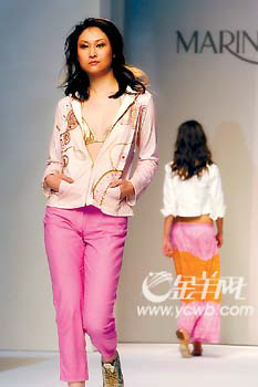 幾大品牌紛紛提倡“拜金”,卻各有“金招”,其中最出位的要屬M(fèi)ARINA RINALDI。但見普通的白襯衫被釘上了金色鉚釘,休閑長(zhǎng)褲的外側(cè)爬滿金光閃閃的蝴蝶與花草,長(zhǎng)長(zhǎng)的頸巾布滿了金色閃片,針織背心的肩頭被金屬片飾加以勾勒,就連風(fēng)衣前襟都散落著大大小小的金屬閃片,令人拍案叫絕。