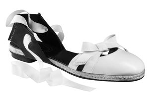 2、絲緞:絲緞是本季平跟鞋的裝飾關鍵,最酷的是襪式夾趾平跟涼鞋,其次是穿插鞋幫的絲帶裝飾,最可愛優(yōu)雅的是絲緞蝴蝶結裝飾。