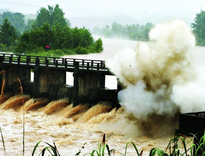 當(dāng)日,咸寧市咸安區(qū)馬橋鎮(zhèn)高賽水電站的攔水壩實(shí)施爆破泄洪。受強(qiáng)降雨影響,咸寧市南川水庫水位超過警戒線,水庫下游至馬橋鎮(zhèn)高賽水電站間部分地區(qū)出現(xiàn)內(nèi)澇。咸安區(qū)防汛指揮部決定爆破高賽水電站的部分?jǐn)r水壩,確保南川水庫及時泄洪。新華社發(fā)(鄧東峰攝)