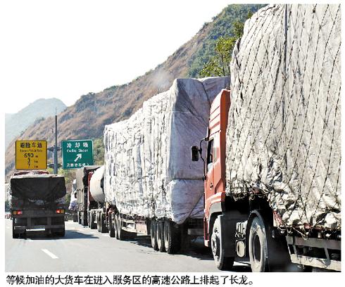 前天上午,巡邏民警從京港澳高速韶關(guān)段北上,只見(jiàn)乳源服務(wù)區(qū)入口、云巖服務(wù)區(qū)南行入口均有長(zhǎng)達(dá)一公里左右的加油車龍。據(jù)了解,近日京珠北各服務(wù)區(qū)都出現(xiàn)大貨車排隊(duì)進(jìn)服務(wù)區(qū)加油的現(xiàn)象,南下的大貨車在湖南境內(nèi)每次只能加到200元的柴油,在京珠北境內(nèi)服務(wù)一次加油最多也是400元,限量供應(yīng)柴油造成了大貨車逢服務(wù)區(qū)必須進(jìn)站加油。行駛的大型車缺油、車龍?jiān)诼访媾抨?duì)進(jìn)服務(wù)區(qū)加油都給交通安全帶來(lái)壓力。