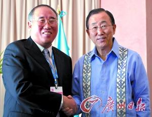 8日,正在坎昆出席聯(lián)合國氣候變化大會的國家發(fā)改委副主任、中國代表團團長解振華(左)與聯(lián)合國秘書長潘基文舉行會見。