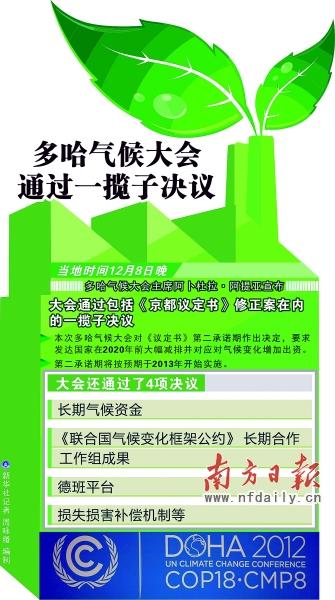 經(jīng)過一天一夜的“加時(shí)”鏖戰(zhàn),多哈氣候大會終于在當(dāng)?shù)貢r(shí)間8日晚上通過一攬子決議,戲劇般地落下帷幕。會議決定從2013年開啟《京都議定書》第二承諾期,為期8年。此外,會議還決定到2015年時(shí)達(dá)成一個(gè)涉及所有國家的有關(guān)2020年后全球應(yīng)對氣候變化行動的協(xié)議,并重申發(fā)達(dá)國家應(yīng)當(dāng)為發(fā)展中國家應(yīng)對氣候變化提供資金支持。