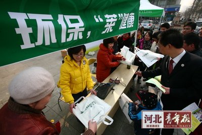 當(dāng)“低碳”口號(hào)越來(lái)越響,別以為低碳離我們有多遠(yuǎn)。細(xì)化到生活中,有時(shí)僅僅是少用一個(gè)塑料袋。昨日上午,省博物館廣場(chǎng),康寶萊(中國(guó))保健品有限公司河北分公司開(kāi)展免費(fèi)發(fā)放環(huán)保袋活動(dòng)。9時(shí)30分開(kāi)始,僅一小時(shí)的時(shí)間,近千只環(huán)保購(gòu)物袋便發(fā)放一空。